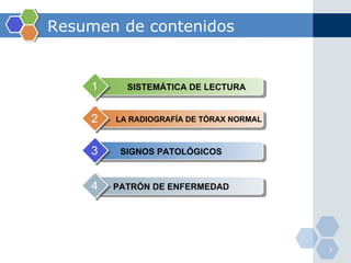 Este documento proporciona una guía sobre la lectura sistemática de radiografías de tórax, incluyendo la apariencia normal, signos patológicos comunes y su descripción. Explica cómo evaluar la calidad de la imagen y estructuras como el mediastino, corazón, pulmones, diafragma y huesos. Describe hallazgos anormales como consolidación, derrame pleural, neumotórax, masas y patrones de enfermedad difusa. El objetivo es enseñar a reconocer varias condiciones médic