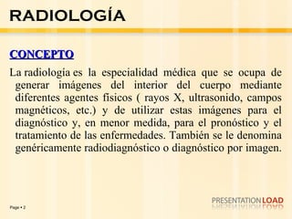 Este documento proporciona una introducción a los principios básicos de la radiología. Explica que la radiología utiliza imágenes médicas generadas por diferentes agentes físicos como los rayos X para diagnosticar enfermedades. Luego resume los tres grandes grupos de la radiología, la física de los rayos X, cómo se forman las imágenes y los componentes básicos de una sala de rayos X. Finalmente, cubre las indicaciones y contraindicaciones del uso de rayos X.