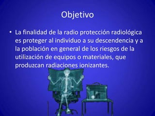 Este documento trata sobre la radioprotección en el ámbito médico. Explica que la radioprotección busca proteger a las personas de los riesgos de las radiaciones ionizantes mediante medidas como aumentar la distancia, usar blindaje y reducir el tiempo de exposición. También cubre temas como la clasificación y monitoreo de la exposición del personal, y la identificación de zonas según su nivel de radiación.