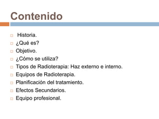 La radioterapia usa radiación ionizante para tratar el cáncer. Puede usarse para curar o reducir tumores en etapas tempranas o para aliviar síntomas. Existen dos tipos principales: radioterapia de haz externo, donde la radiación proviene de una máquina externa, y braquiterapia, donde se coloca la fuente de radiación dentro del cuerpo. El tratamiento requiere planificación precisa para maximizar la dosis a los tumores y minimizar la exposición de los tejidos sanos. Los efectos sec