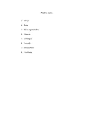 Este documento describe la importancia de enseñar la escritura de ensayos argumentativos en la educación colombiana para mejorar las habilidades comunicativas y el lenguaje. Explica que la pedagogía colombiana se enfoca en desarrollar competencias comunicativas en estudiantes y profesores para producir textos claros. También analiza perspectivas como la literal, cognoscitiva y sociocultural para la enseñanza de la escritura de ensayos. Concluye que estos ensayos permiten organizar ideas y que su producción requi