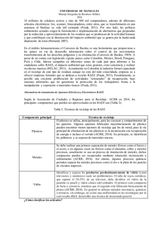 Colombia genera grandes cantidades de Residuos de Aparatos Eléctricos y Electrónicos (RAEE) que a menudo son dispuestos de manera inadecuada, causando contaminación. Los RAEE contienen materiales peligrosos como plomo y mercurio. Existen oportunidades para el aprovechamiento de los RAEE a través del reciclaje, pero también desafíos como la necesidad de grandes inversiones y el manejo adecuado de residuos peligrosos. Se requiere una regulación clara y modelos de gestión de RA