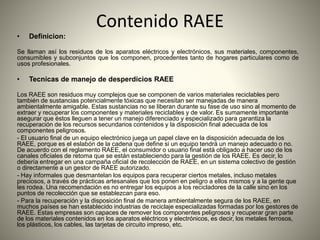 Este documento trata sobre los residuos de aparatos eléctricos y electrónicos (RAEE), incluyendo su definición, técnicas de manejo, impacto ambiental y en la salud, marco jurídico y formas comunitarias de reciclaje. Explica que los RAEE contienen materiales tóxicos que deben manejarse de forma segura para proteger la salud y el medio ambiente. También destaca la importancia del reciclaje y la reutilización de estos residuos.