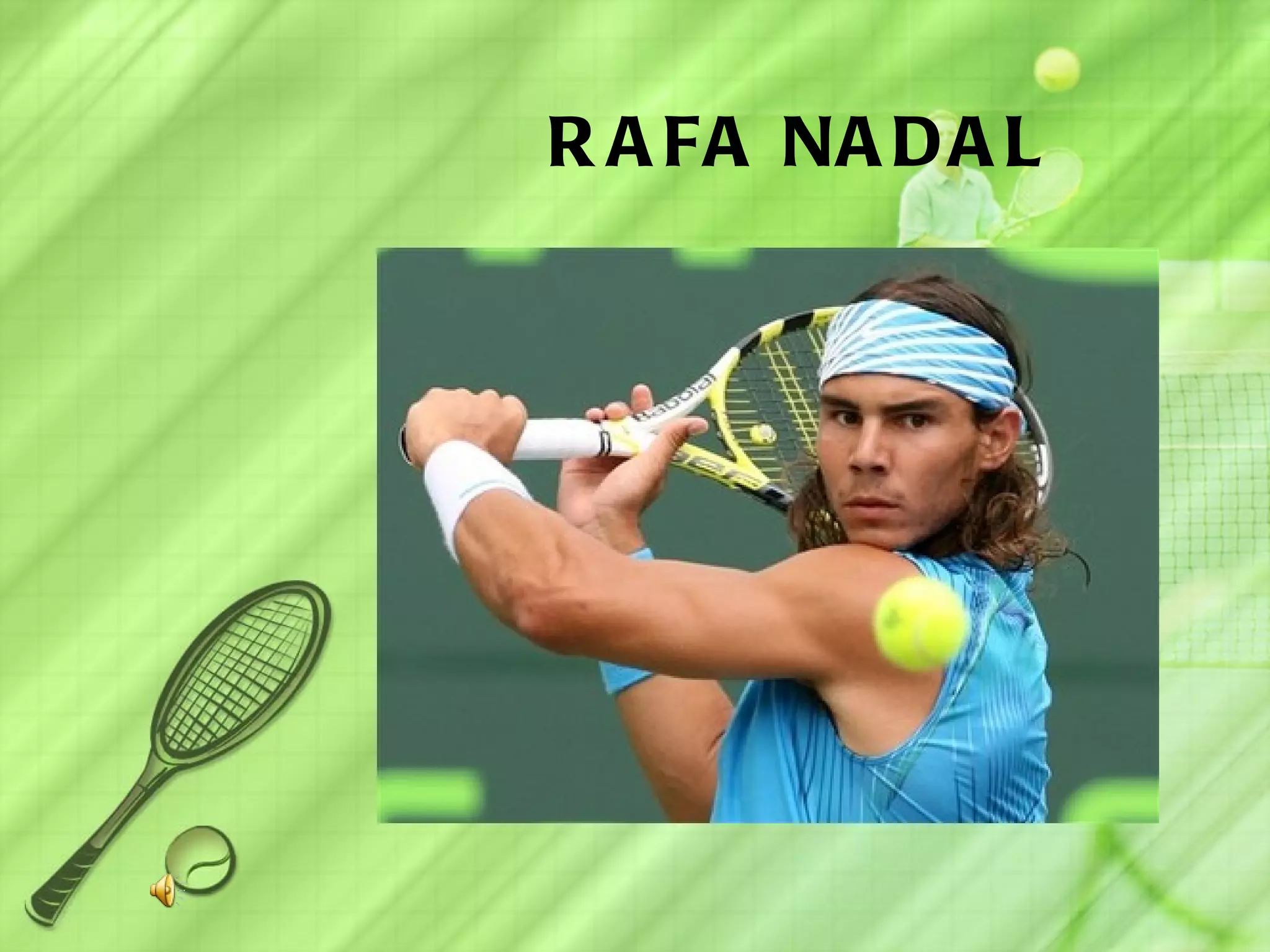 Rafael Nadal Parera es un tenista español nacido en 1986 en Manacor, Mallorca. Es el actual número 1 del mundo y ha ganado 11 títulos de Grand Slam, destacando sus 6 victorias en Roland Garros. Nadal se caracteriza por su fuerte ética de trabajo y dominio en canchas de arcilla, donde mantiene un récord casi perfecto. Fuera de la cancha, dirige la Fundación Rafa Nadal que apoya proyectos educativos y deportivos para niños en necesidad.