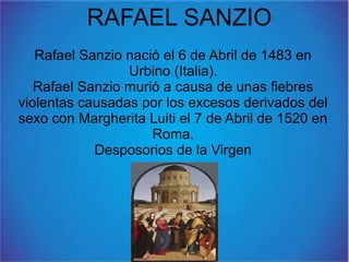 Rafael Sanzio fue un pintor renacentista italiano que nació en 1483 en Urbino y murió en 1520 en Roma. Se formó en los talleres de varios artistas de prestigio después de quedar huérfano. Una de sus pinturas más famosas fue La escuela de Atenas, realizada entre 1509 y 1510, que representa una sesión entre filósofos clásicos como Platón, Aristóteles y Sócrates.