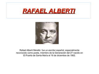 Rafael Alberti fue un poeta español miembro de la Generación del 27. Nació en 1902 en El Puerto de Santa María y escribió su primer libro de poemas, Marinero en tierra, después de la muerte de su padre en 1920. Pasó la mayor parte de su exilio en París y Buenos Aires tras la Guerra Civil, y no regresó a España hasta 1977 después de la muerte de Franco. Alberti es conocido por su poesía popular, surrealista y política, y por ser uno de los poetas españoles más destacados del siglo XX.