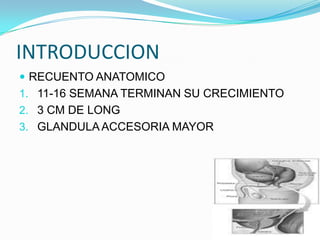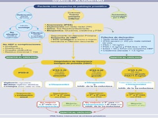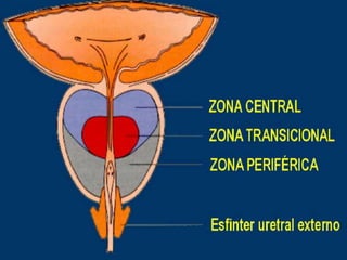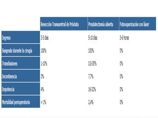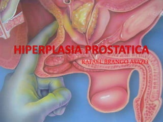 El documento describe la anatomía, fisiología, factores de riesgo, síntomas, diagnóstico y tratamientos de la hiperplasia prostática benigna. La HPB es el agrandamiento benigno de la próstata causado por un aumento del tejido prostático y es más común en hombres mayores de 50 años. Los síntomas incluyen disuria, nicturia y flujo urinario débil. El diagnóstico incluye examen rectal, PSA y uroflujometría. Los tratamientos son farmacológicos con blo