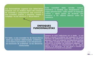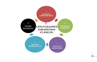Este documento presenta un resumen de varias teorías sociológicas de la educación, incluyendo las ideas de Durkheim, Parsons, la teoría del capital humano, Bernstein y enfoques marxistas. Durkheim consideró que la educación está conectada a las instituciones sociales y que su función es definir la cultura de una sociedad. Parsons argumentó que el sistema educativo legitima las desigualdades de logro entre estudiantes. La teoría del capital humano ve a la educación como una inversión que aumenta la productividad. Bernstein des