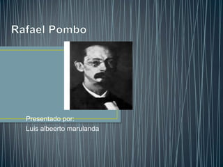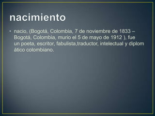 Este documento presenta una biografía detallada del poeta colombiano Rafael Pombo. Describe su lugar de nacimiento, su educación y su carrera como poeta, traductor y periodista en Colombia. Se destacan algunos de sus poemas más famosos como "Elvira Tracy" y "En el Niágara".
