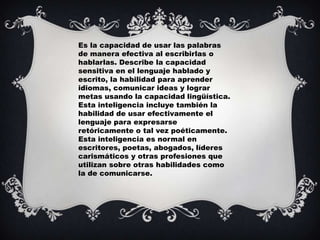 La inteligencia lingüística se refiere a la capacidad de usar efectivamente el lenguaje hablado y escrito para comunicar ideas, aprender idiomas y lograr objetivos. Incluye habilidades como la expresión retórica, poética y el procesamiento del lenguaje. Se desarrolla naturalmente en escritores, abogados y líderes y se ve afectada por daños cerebrales.