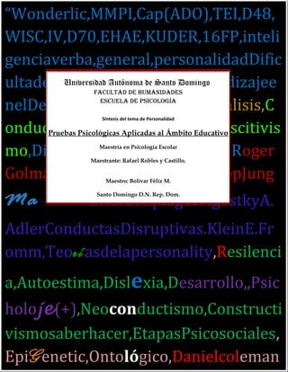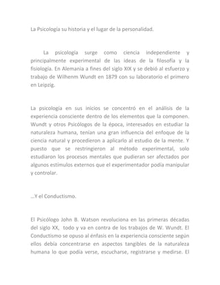 El documento aborda la evolución de la psicología y el estudio de la personalidad, comenzando con Wilhelm Wundt y el conductismo de John B. Watson, y resaltando la influencia del psicoanálisis de Sigmund Freud. Se discuten diferentes métodos y herramientas de evaluación de la personalidad, tales como el MMPI, las técnicas proyectivas, y entrevistas clínicas, destacando la importancia de la validez y confiabilidad en estas evaluaciones. Finalmente, se analizan los enfoques ideográfico y nomotético en la investigación de la personalidad, así como la necesidad de teorías bien fundamentadas en datos empíricos.
