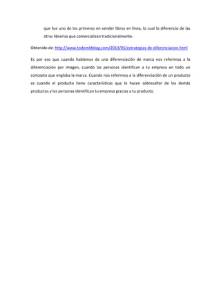 Este documento discute las estrategias de diferenciación de marca propuestas por Philip Kotler, incluyendo diferenciación por producto (atributos del producto), personal (capacitación del personal), imagen (estatus y aspiración) y canal (cobertura de distribución). La diferenciación de marca se refiere a identificar a la empresa por su imagen general, mientras que la diferenciación de producto se refiere a características que hacen sobresalir el producto de otros.
