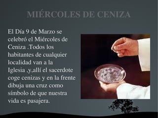 El documento resume las principales celebraciones y eventos de la Semana Santa cristiana. Comienza con el Miércoles de Ceniza y la Cuaresma de 40 días. Luego describe los eventos clave de la Semana Santa, incluyendo el Domingo de Ramos, el Jueves Santo con la Última Cena, el Viernes Santo con la crucifixión y muerte de Jesús, y el Domingo de Resurrección cuando María y las otras mujeres descubren la tumba vacía. Concluye que la Pascua significa que Jesús vive