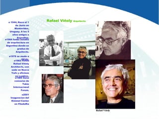 Rafael Viñoly es un arquitecto uruguayo nacido en 1944 que fundó su estudio de arquitectura en Argentina en 1964 y se mudó a los Estados Unidos en 1978. Algunos de sus proyectos más destacados incluyen el Tokio International Forum completado en 1996 en Japón, el Kimmel Center for the Performing Arts inaugurado en 2001 en Filadelfia y el Boston Convention & Exhibition Center. Viñoly cree en un enfoque colaborativo y de grupo de trabajo para el diseño arquitectónico que explora múltiples alternativas para satisf