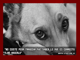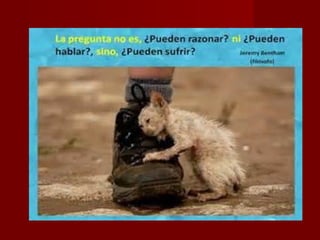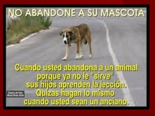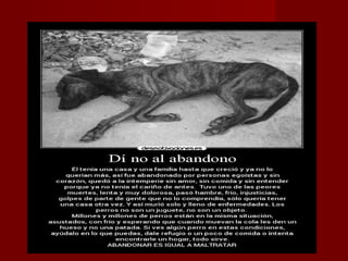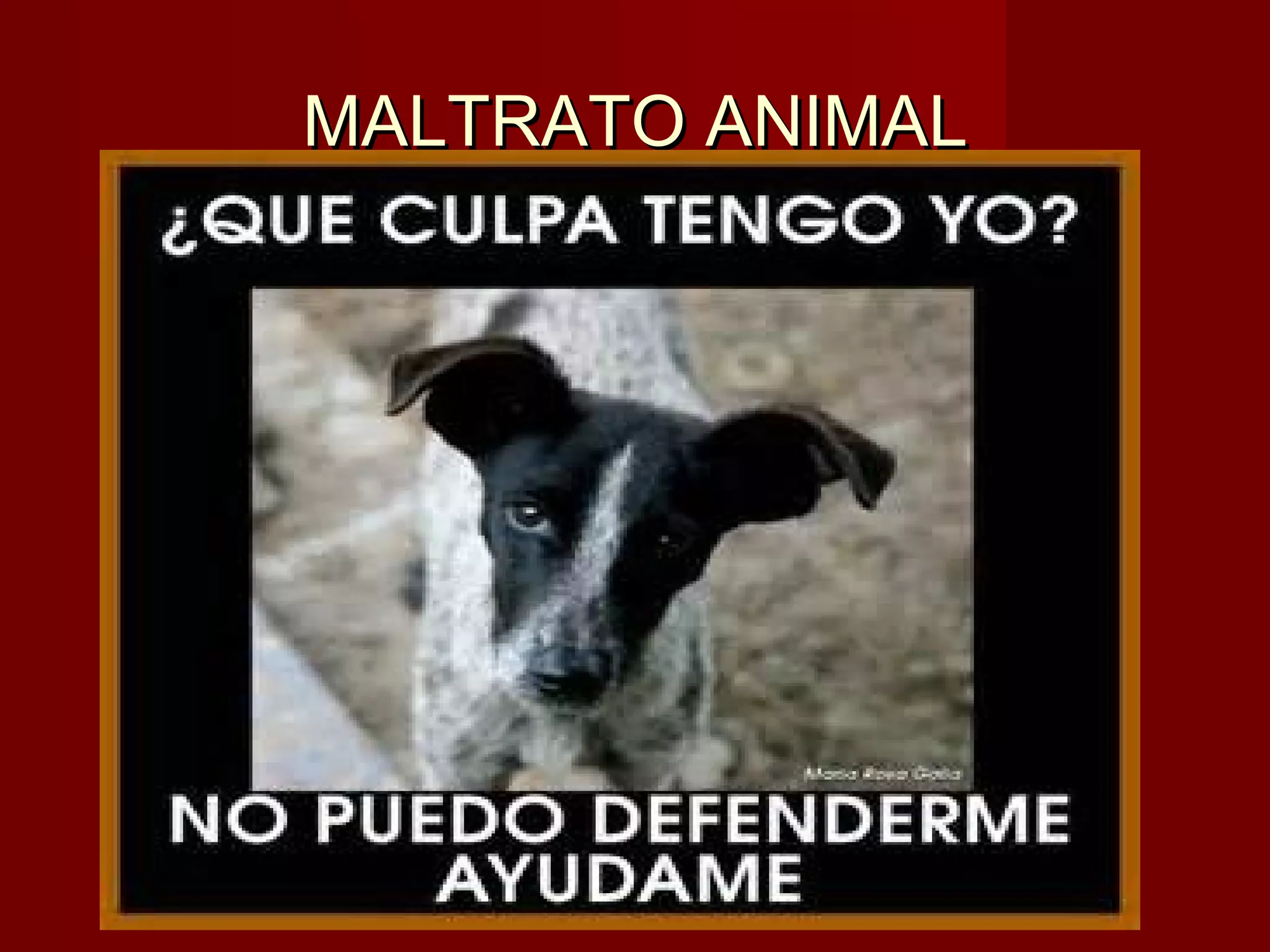 Este documento describe varias formas de maltrato animal como el encierro, la desnutrición, el abandono y la muerte de animales. Señala que los animales sufren en circos y experimentos científicos donde son forzados a hacer cosas que no quieren. El documento pide concienciar sobre el maltrato animal y denunciar a quienes lo cometan, ya que los animales también sienten dolor y miedo.