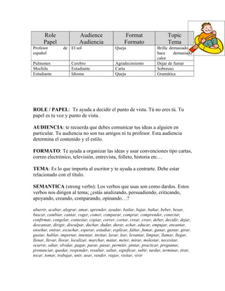 El resumen presenta cuatro roles, audiencias, formatos y temas brevemente: un profesor de español que se queja del sol brillante y el calor excesivo en una queja dirigida al sol; los pulmones que agradecen dejar de fumar en una carta al cerebro; una mochila que se queja del sobreuso en una carta a un estudiante; y un estudiante que se queja de la gramática en un idioma en una queja dirigida al idioma.