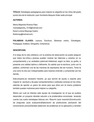 Este documento describe un proyecto para desarrollar estrategias pedagógicas para mejorar la caligrafía en niños de quinto grado. El proyecto utilizará cuadernillos, resumen, preguntas y predicciones para mejorar la escritura. El objetivo es que los niños adquieran habilidades de lectura y escritura. La investigación se llevará a cabo con 33 niños en cuarto grado y 37 niños en quinto grado. Se usará la metodología de investigación-acción para diagnosticar problemas, aplic