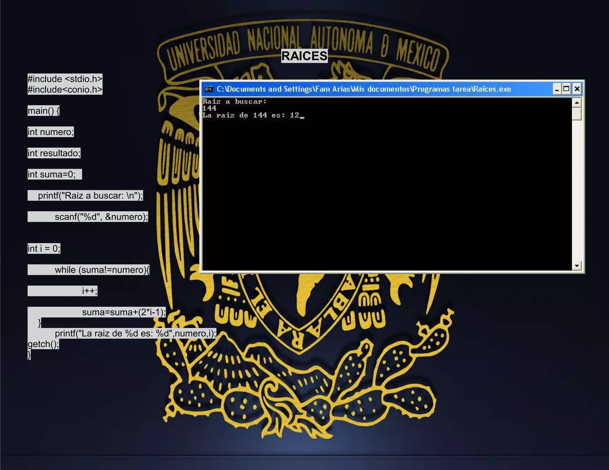 Este programa calcula la raíz cuadrada de un número introducido por el usuario mediante un algoritmo iterativo. El programa suma los términos impares consecutivos hasta que la suma supere al número de entrada, y devuelve como resultado la cantidad de términos sumados.