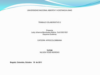 Este documento presenta información sobre la música y los bailes afrocolombianos. Discute los instrumentos musicales africanos que se utilizan, como tambores y marimbas. Explica que la música tiene un alto nivel de participación comunitaria y enfatiza el canto sobre la percusión. También describe varios bailes tradicionales de la costa pacífica y el caribe colombiano, como el currulao, la contradanza y el abozao, que mantienen herencias culturales africanas. Finalmente, señala que la cultura