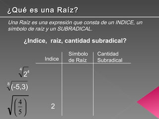 El documento explica los conceptos básicos de las raíces. Define una raíz como una expresión que consta de un índice, un símbolo de raíz y un subradical. Explica que una raíz es equivalente a una potencia con exponente fraccionario y presenta algunas propiedades básicas como la multiplicación y división de raíces de igual índice y la raíz de una raíz. Finalmente, muestra cómo descomponer raíces en términos semejantes.