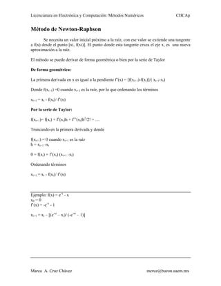 Este documento describe tres métodos numéricos para encontrar raíces de funciones: el método de bisección, el método de Newton-Raphson y el método de la secante. El método de bisección requiere un intervalo inicial que contenga la raíz. El método de Newton-Raphson necesita un valor inicial cercano a la raíz para derivar una tangente a la función. El método de la secante aproxima la derivada usando dos puntos previos en lugar de derivar la función.
