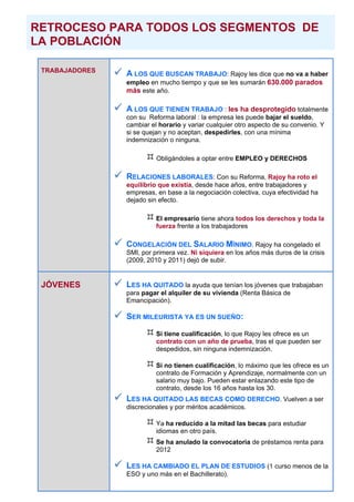 En 100 días, el gobierno de Rajoy ha hecho retroceder a España al siglo pasado. En lugar de sacar a España de la crisis y crear empleo como prometió, ha llevado al país a la recesión, ha aumentado el paro en 630.000 personas y ha subido los impuestos, afectando principalmente a las clases medias. Además, ha recortado derechos de los trabajadores con su reforma laboral y ha reducido inversiones en ciencia e innovación, sanidad y energías renovables.