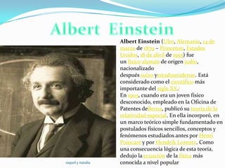 El documento proporciona información biográfica sobre cuatro importantes científicos: Galileo Galilei, un astrónomo, filósofo, matemático y físico italiano del Renacimiento; Albert Einstein, un físico alemán que desarrolló la teoría de la relatividad; Isaac Newton, un físico, filósofo y matemático inglés que describió la ley de la gravitación universal y las leyes del movimiento; y Gregor Mendel, un monje agustino que describió las leyes de la herencia genética a trav