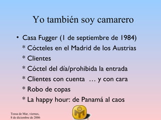 Este documento contiene un artículo sobre cócteles y su historia escrito por Juan Luís Recio. Describe varios cócteles famosos como el Old Fashioned, Rob Roy, Manhattan y otros, explicando sus orígenes e ingredientes. También habla sobre tendencias emergentes en coctelería como el uso de ingredientes naturales y funcionales.