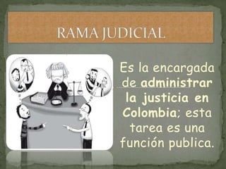 Este documento describe diferentes instituciones de justicia en Colombia. La Corte Constitucional es la encargada de administrar justicia y proteger la Constitución. Está conformada por 9 magistrados que sirven por 8 años. La Corte Suprema de Justicia, conformada por 28 magistrados que sirven 8 años, es el máximo tribunal ordinario con atribuciones como juzgar altos funcionarios. La Fiscalía, conformada por magistrados a nivel departamental, investiga delitos y acusa a los presuntos infractores ante los tribunales competentes.