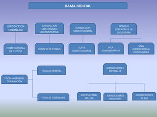 La Rama Judicial está conformada por cuatro jurisdicciones: ordinaria, contencioso-administrativa, constitucional y especiales. Incluye a la Corte Suprema de Justicia, el Consejo de Estado, la Corte Constitucional y la Fiscalía General. La Rama Judicial se encarga de administrar justicia mediante pronunciamientos definitivos y proteger los derechos constitucionales.