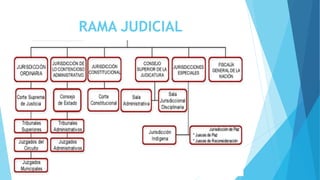 Este documento presenta una descripción general de la rama judicial en Colombia. Explica las dos principales jurisdicciones que la componen (ordinaria y contencioso administrativo) y los organismos que las integran, como la Corte Suprema de Justicia, el Consejo de Estado y los tribunales. También define las funciones de las diferentes salas que conforman estos organismos y los principios que rigen la administración de justicia en el país.