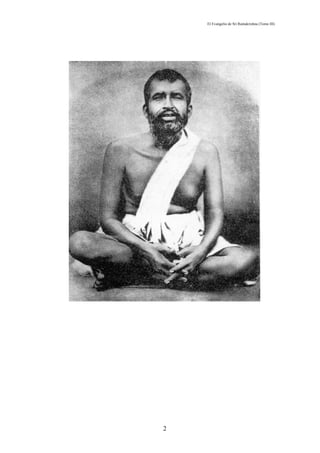 Este documento presenta el índice de contenidos del Tomo III del libro "El Evangelio de Sri Ramakrishna". Incluye 47 capítulos que describen las enseñanzas y experiencias espirituales de Sri Ramakrishna con sus devotos y discípulos como Narendra, así como sus conversaciones sobre temas como la devoción, la naturaleza de Dios, el ego y la liberación.