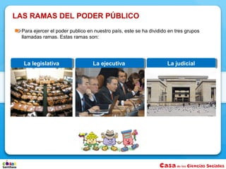 El documento describe las tres ramas del poder público en Colombia: la legislativa, la ejecutiva y la judicial. La legislativa elabora las leyes y la conforman el Senado, Cámara de Representantes, asambleas departamentales y consejos municipales. La ejecutiva está representada por el Presidente, gobernadores y alcaldes a nivel nacional, departamental y municipal. La judicial administra justicia y la conforman la Corte Suprema, Consejo de Estado y otras cortes.