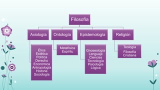 Este documento lista las principales ramas de la filosofía, incluyendo la axiología, ética, estética, política, derecho, economía, antropología, historia, sociología, ontología, metafísica, epistemología, gnoseología, lenguaje, ciencias, tecnología, psicología, lógica, religión, teología y filosofía cristiana. Cubre una amplia gama de temas filosóficos desde valores hasta ciencia, espíritu y teología.