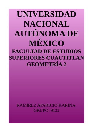 Este documento contiene información sobre un curso de geometría 2 impartido en la Facultad de Estudios Superiores Cuautitlán de la Universidad Nacional Autónoma de México. El documento incluye bocetos y laminas finales realizados por la alumna Karina Ramírez Aparicio para el grupo 9122.