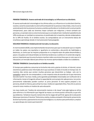 Este documento discute varias tendencias globales que están influyendo en la reforma educativa en México, incluyendo: 1) el avance de la tecnología y su impacto en la comunicación y enseñanza, 2) la globalización del mercado laboral y la educación, 3) la creciente especialización de conocimientos, y 4) un enfoque en valores como el desarrollo sostenible. También analiza las metas de la reforma para mejorar la calidad, cobertura y equidad de la educación básica mexicana ante el rápido