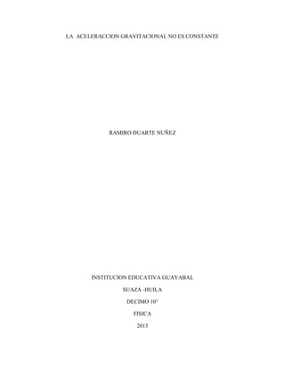 Este documento discute cómo la aceleración gravitacional no es constante y varía según la altura y latitud. Explica que aunque inicialmente se considera constante, en realidad cambia levemente en diferentes lugares. Luego describe un experimento para medir la aceleración gravitacional usando un péndulo y cronómetro, y calcula el valor obtenido con errores. Finalmente, concluye que la masa gravitacional de un cuerpo es igual a su masa inercial y que la aceleración de los cuerpos en caída libre es la misma independientemente de su