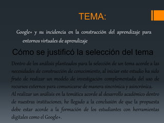 Este documento describe un proyecto de investigación sobre la incidencia de Google+ y sus herramientas en la construcción del aprendizaje en entornos virtuales. El objetivo general es demostrar cómo Google+ puede usarse para potenciar los objetivos y habilidades de los estudiantes en cursos virtuales. El enfoque de investigación será cualitativo, utilizando métodos como observación y revisión de literatura para analizar el tema de manera holística.