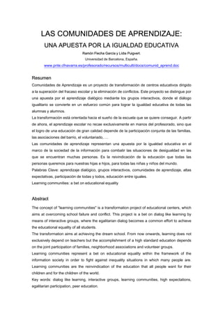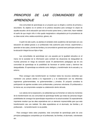 Una comunidad de aprendizaje es un proyecto educativo que busca lograr la igualdad educativa a través de la participación de toda la comunidad, incluyendo familias, asociaciones vecinales y voluntarios. Se basa en principios como altas expectativas para todos los estudiantes, aprendizaje dialógico en grupos, y liderazgo compartido. Su objetivo es transformar las escuelas para que ningún estudiante quede marginado por su clase social, etnia u otros factores.