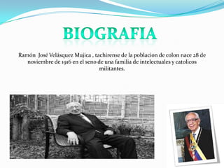 Ramón José Velásquez Mujica asumió la presidencia de Venezuela de forma transitoria en 1993 luego de que Carlos Andrés Pérez fuera suspendido por la Corte Suprema de Justicia. Durante su breve mandato, Velásquez aprobó leyes como la del IVA y reformas bancarias. También se produjo la crisis financiera, el indulto a un narcotraficante y la quiebra de un banco con fuga de divisas. A pesar de las dificultades, Velásquez logró avances en descentralización. Su gobierno buscó