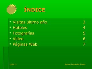 El documento presenta estadísticas sobre el turismo en Nava durante el último año, incluyendo visitas y pernoctaciones mensuales. También enumera los hoteles de la ciudad clasificados por estrellas y su capacidad, y proporciona fotografías, un video, y enlaces a páginas web relevantes sobre Nava.