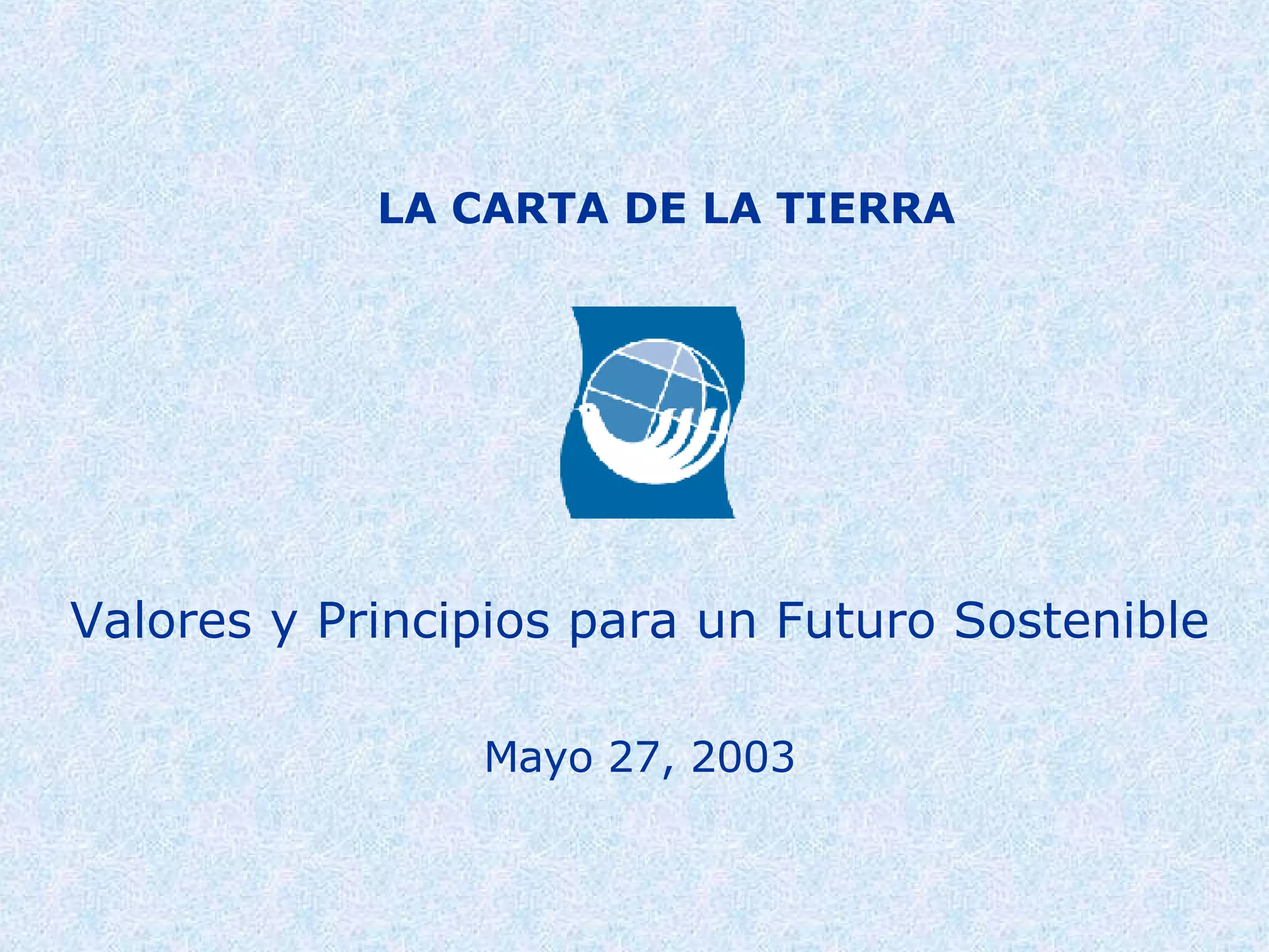 El documento presenta la Carta de la Tierra, un marco ético para un futuro sostenible. Explica que la Carta de la Tierra promueve valores como el respeto a la naturaleza, los derechos humanos y la justicia económica. Además, describe algunos ejemplos de cómo organizaciones en Costa Rica, Canadá, Brasil y Japón están implementando la Carta de la Tierra en sus comunidades y programas educativos.