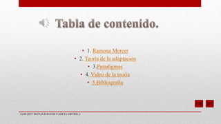 Este documento resume la teoría de la adaptación de Ramona Mercer. Mercer desarrolló esta teoría para explicar la transición a la maternidad. La teoría se centra en cuatro conceptos clave: persona, salud, entorno y enfermería. También describe tres sistemas (micro, meso y macro) que influyen en la adopción del rol maternal de acuerdo a la teoría de Bronfenbrenner. El documento concluye con algunas referencias bibliográficas sobre la teoría.