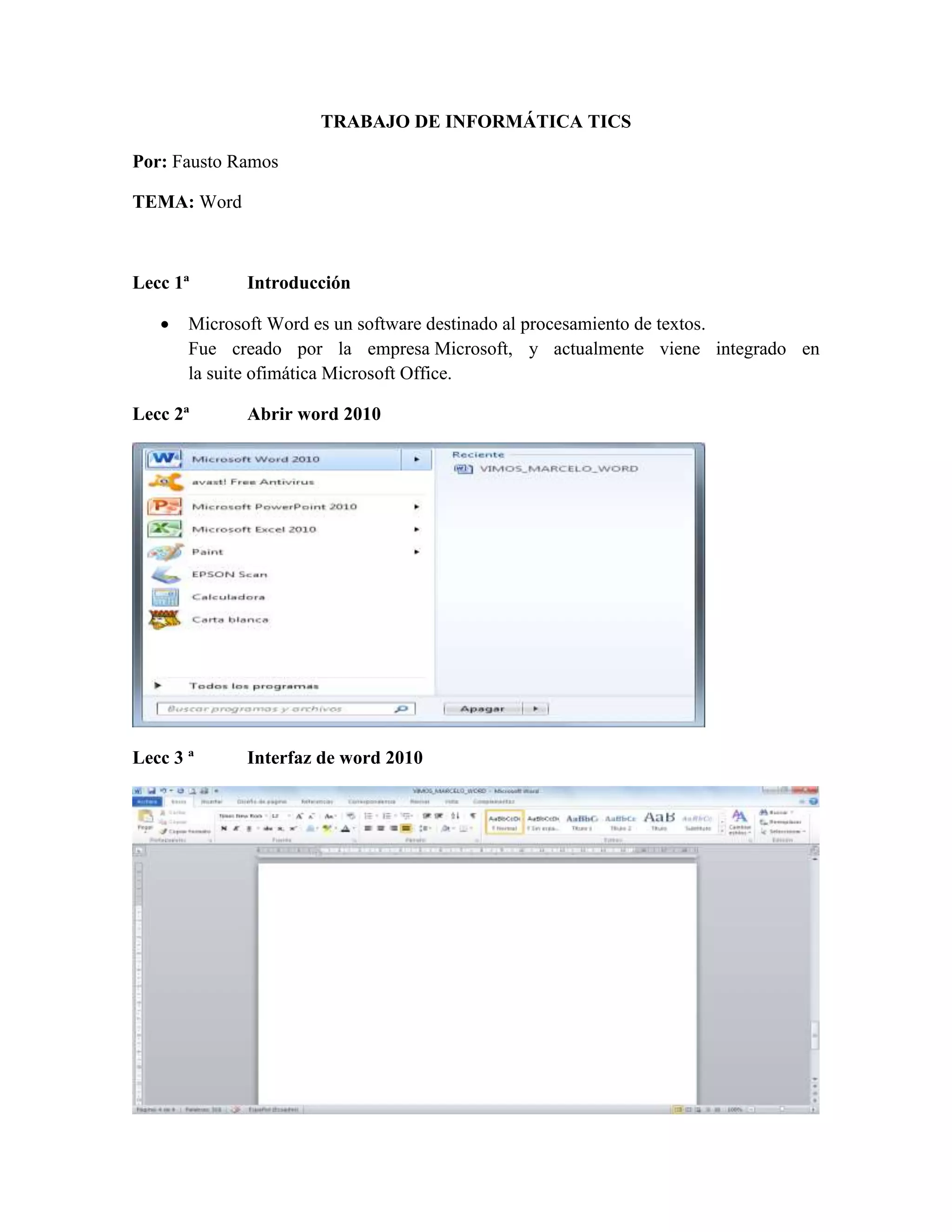 Este documento contiene 41 lecciones sobre el uso del software Microsoft Word. Cubre temas como la interfaz de usuario, menús como Archivo, Vista y formato, y funciones como seleccionar texto, insertar tablas, imágenes, gráficos y capturas de pantalla. El objetivo es enseñar las capacidades y herramientas básicas de Word para procesamiento de textos.
