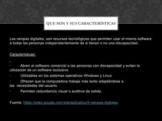 Las rampas digitales son recursos tecnológicos que permiten usar el mismo software independientemente de discapacidades mediante adaptaciones como permitir que computadoras trabajen más lento, ofrecer redundancia visual o auditiva, y utilizar teclados en lugar de ratones. Proporcionan ejemplos como software que permite mover el cursor con un solo movimiento voluntario, cámaras web para controlar el cursor, escáneres de pantalla, y lectores de pantalla para dificultades visuales.