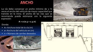Una rampa es un elemento que permite vincular dos lugares a diferentes alturas para ascender o descender de forma segura. En minería subterránea, las rampas son galerías con una ligera pendiente que sirven como acceso principal a los diferentes niveles de una mina. En minería a cielo abierto, las rampas son vías especialmente diseñadas para el tránsito de vehículos entre los frentes de explotación y los centros de acopio. Para una rampa de 320 metros que comunica tres niveles de 10 metros cada uno, la pend
