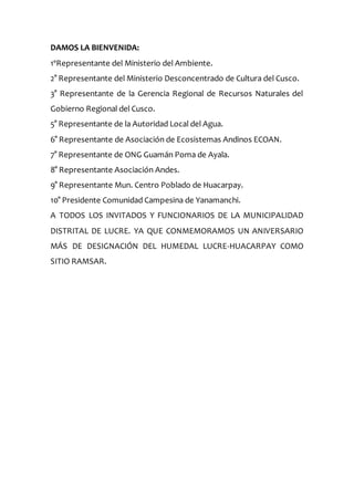 Este documento describe las actividades realizadas para conmemorar otro aniversario de la designación del Humedal Lucre-Huacarpay como sitio Ramsar. Se llevaron a cabo varios eventos como una conferencia de prensa, un concurso de tejedores de totora, charlas educativas, una campaña de vacunación canina, un maratón deportivo, una limpieza del humedal y una exposición fotográfica. El objetivo general fue sensibilizar a la población local y regional sobre la importancia de conservar este humedal
