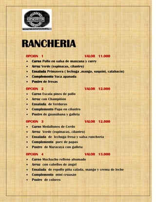 El documento presenta seis opciones de menús para un almuerzo o cena en un restaurante, con precios entre $11,000 y $13,000 pesos colombianos. Cada opción incluye platos de carne, arroz o ensalada, un complemento y postre. También se ofrecen otras opciones como bandeja paisa o parrillada. Se lista una variedad de licores, vinos y cervezas con sus precios por trago, media botella o botella.