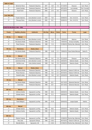 Este documento presenta los resultados del Ranking Anual 2012 de la Asociación de Atletismo del Sur del Chubut, dividiendo los resultados en categorías preinfantiles, infantiles y cadetes mujeres. Proporciona el puesto, nombre, institución, año de nacimiento, marca, viento, fecha, torneo y lugar para cada disciplina en cada categoría.