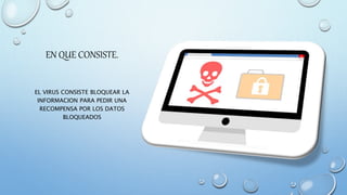 Este documento describe un ataque de ransomware reciente que afectó a más de 60,000 computadoras en 74 países. El malware, llamado WannaCry, bloquea los archivos de la computadora infectada y pide un rescate para desbloquearlos. Se propagó a través de una vulnerabilidad de Windows y fue detenido por un experto británico que descubrió una dirección URL que desactivaba el malware. El ataque afectó a 20 empresas privadas en Colombia.